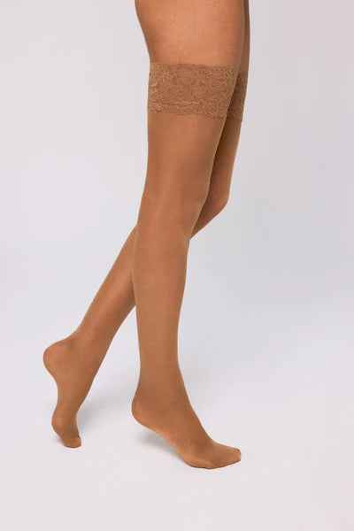 Media de 40 DEN. Con liga de blonda y dos bandas de silicona para una sujeción total.
